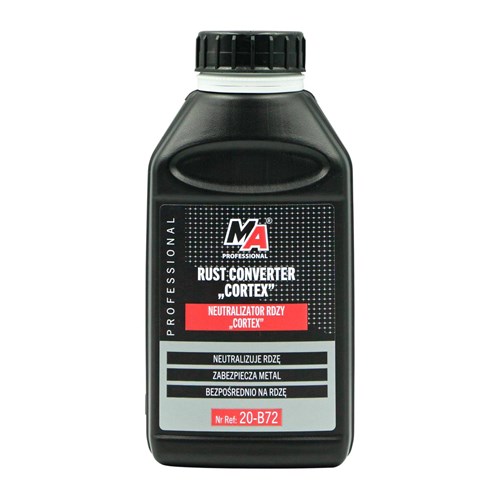Wysokiej jakości neutralizator rdzy hamujący rozwój korozji. Po nałożeniu na skorodowaną powierzchnię zmienia aktywna rdzę w stabilny neutralny materiał zabiegając trwałemu uszkodzeniu elementu. Jeżeli przedmiot narażony jest na zewnętrzne warunki atmosferyczne pokrytą neutralizatorem rdzy powierzchnię należy dodatkowo zabezpieczyć lakierem / farbą.