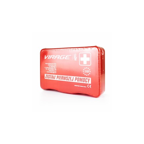 Elementarne wyposażenie w opatrunki pierwszej pomocy. Wszystkie produkty w apteczce posiadają CE i wyprodukowano je zgodnie z normami UE. Instrukcja "Pierwsza pomoc w nagłych wypadkach".Wyposażenie apteczki:Kompres 5 cm x 5 cm 1 szt.Opaska elastyczna 4 m x 6 cm 1 szt.Chusta trójkątna 1 szt.Plaster z opatrunkiem 10 cm x 6 cm 1 szt.Plaster 72 mm x 19 mm 1 szt.Chusteczka alkoholowa 1 szt.Rękawice winylowe 2 sztAgrafka 1 szt.Instrukcja udzielania pierwszej pomocy 1 szt.