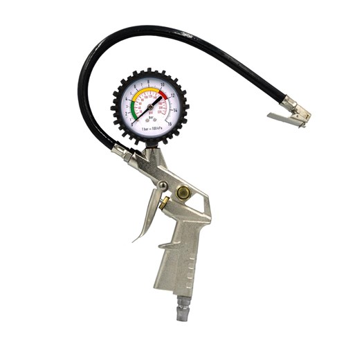 Pistolet do pompowania wyposażony w precyzyjny manometr, który umożliwia kontrolę ciśnienia powietrza w pompowanym produkcie. Obudowany gumą co zapewnia mu dodatkową ochronę przed uszkodzeniem.