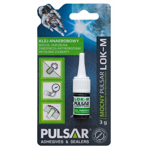 PULSAR LOK - klej anaerobowy. Służy do zabezpieczania, mocowania i uszczelniania metalowych elementów: jego utwardzanie następuje po odcięciu dopływu powietrza (w szczelinie złącza) i w kontakcie z metalem. Zabezpiecza gwinty przed samoczynnym luzowaniem się i rozkręcaniem na skutek obciążeń dynamicznych.