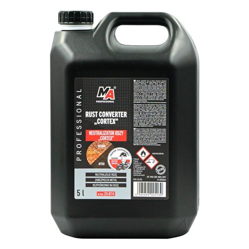 Wysokiej jakości neutralizator rdzy hamujący rozwój korozji. Po nałożeniu na skorodowaną powierzchnię zmienia aktywna rdzę w stabilny neutralny materiał zabiegając trwałemu uszkodzeniu elementu. Jeżeli przedmiot narażony jest na zewnętrzne warunki atmosferyczne pokrytą neutralizatorem rdzy powierzchnię należy dodatkowo zabezpieczyć lakierem / farbą.