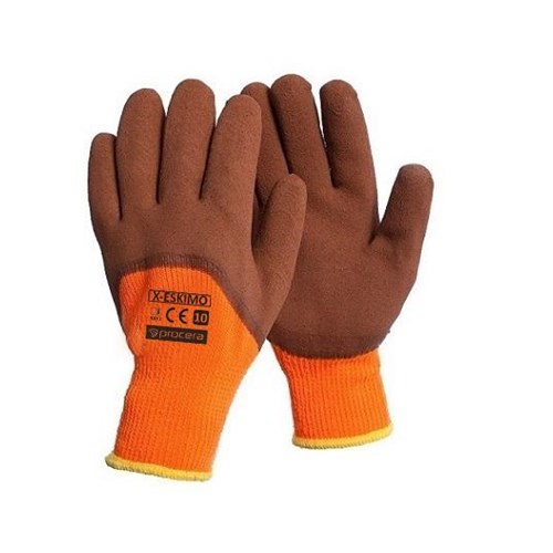Rękawice X-ESKIMO wykonane z ocieplanej dzianiny poliestrowo bawełnianej w kolorze pomarańczowym, powlekanej pianką lateksową w części chwytnej oraz całe palce w części grzbietowej.