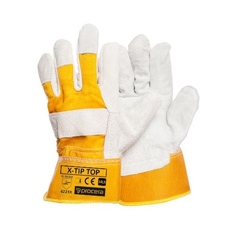 Rękawice robocze wzmocnione skórą dwoinową, całodłonicowe, tkanina drelichowa w kolorze żółtym.