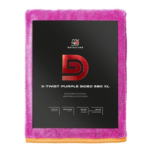 X-TWIST PURPLE SIDED 580 XL to duża, dwustronna mikrofibra o wymiarach 60x90 cm, idealna do osuszania samochodu i kompleksowej pielęgnacji.
