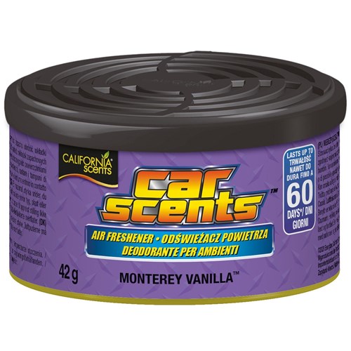 Aluminiowe puszki zapachowe do samochodu i domu gwarantujące aż do 60 dni działania. Skuteczna dawka dyskretnego aromatu do Twojego auta dzięki włóknom nasączonym olejkami eterycznymi. Możliwość kontroli intensywności zapachu poprzez specjalnie zaprojektowanym przykrywkom. Aluminiowe zamknięcie szczelnie zachowuje zapach wewnątrz puszki. Idealne do różnych typów pogody. Odporne na wysokie temperatury i wilgotność. O zapachu Monterey Vanilla.