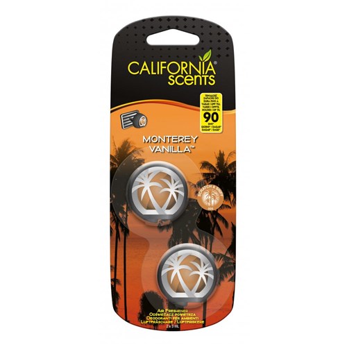 Odświeżacze powietrza idealne do nawiewów. Aż do 90 dni zapachu (45 dni / 1 szt.). Dyskretny rozmiar, który po umieszczeniu w kratce nawiewowej nie blokuje przepływu powietrza. Możliwość kontroli intensywności aromatu dzięki specjalnemu mechanizmowi na spodzie membrany. Każda membrana zawiera 3 ml olejku zapachowego. Zawierają technologię eliminującą nieprzyjemne zapachy. O zapachu Monterey Vanilla.