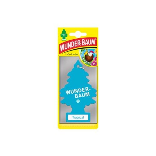 WUNDER-BAUM papierowy zapach samochodowy w kształcie choinki. Utrzymujący się do ośmiu tygodni aromat. Skutecznie neutralizujący nieprzyjemne zapachy np. dymu tytoniowego, wilgoci. Słodki i owocowy zapach "Tropical", łączy w sobie egzotyczne aromaty kokosa i ananasa.