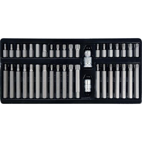 Profesjonalny zestaw bitów, służący do odkręcania śrub specjalnych typu: torx, spline, hex. Wykonany z najwyższej jakości stali stopowej narzędziowej S2, która charakteryzuje się wysoką twardością HRC 58-62, jednolitą, drobnoziarnistą strukturą materiału, odpornością na skręcanie, wysokim momentem dokręcania, doskonałym zahartowaniem. Różnorodność bitów zapewnia możliwość wykonania wielu prac w specjalistycznych serwisach mechanicznych i samochodowych.