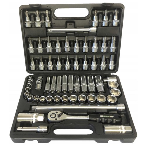 Zestaw składa się z 61 elementów - nasadki, grzechotka, przedłużki itp. Do zastosowania zarówno w serwisie stacjonarnym, jak i serwisie mobilnym.