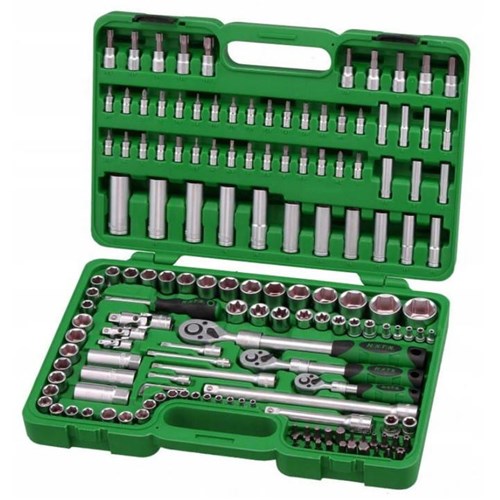 W zestawie:nasadki:1/4` sześciokątne krótkie: 4; 4,5; 5; 5,5; 6; 7; 8; 9; 10; 11; 12; 13, 14 mm;1/4` sześciokątne długie ( 50 mm): 4, 5, 6, 7, 8, 9, 10 mm;3/8` sześciokątne krótkie: 10; 11; 12; 13, 14, 15, 16, 17, 18, 19 mm;3/8` sześciokątne długie (63 mm): 10, 11, 12, 13, 14, 15 mm;1/2` sześciokątne krótkie: 10, 11, 12, 13, 14, 15, 16, 17, 18, 19, 20, 21, 22, 24, 27, 30, 32 mm;1/2` sześciokątne długie ( 77 mm): 14, 15, 17, 19, 22 mm;1/4" z gniazdem Torx: E4, E5, E6, E7, E83/8" z gniazdem Torx: E10, E12, E14, E16, E181/2" z gniazdem Torx: E20, E22, E24nasadki do świec 1/2`: 16, 21 mm;nasadka do świec 3/8`: 16mm;grzechotka teleskopowa 1/4" (72 zębów)grzechotka teleskopowa 3/8" (72 zębów)grzechotka teleskopowa 1/2" (72 zębów)przegub kardana 1/4`;przegub kardana 3/8`;przegub kardana 1/2`;przedłużki 1/4": 50, 100mmprzedłużki 3/8": 75, 150mmprzedłużki 1/2`: 125, 250 mm;adapter 3/8" do końcówek 10mmadapter 1/2" do końcówek 10mmitp.