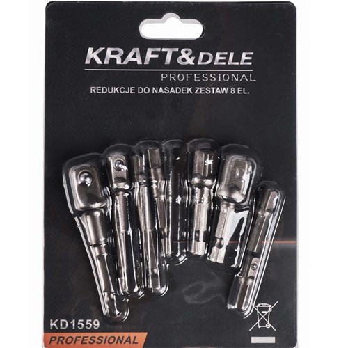 Profesjonalny zestaw adapterów na nasadki marki Kraft&Dele o oznaczeniu KD1559. To praktyczny komplet redukcji i adapterów do wkrętarki, umożliwiający pracę z różnymi rozmiarami nasadek.